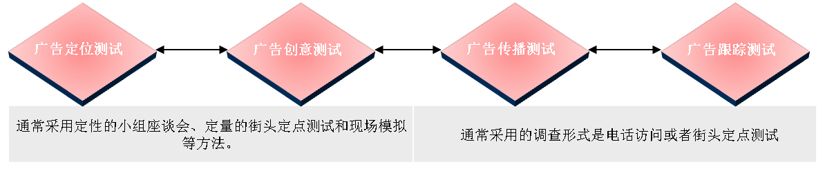 量点咨询将广告测试模型根据广告运作的程序划分为“广告定位测试、广告创意测试、广告传播测试和广告跟踪测试”4部分,具体内容如下所示: